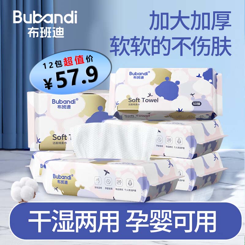 布班迪儿童绵柔巾婴儿干湿两用宝宝专用新生绵柔纸巾洗脸巾一次性加厚 50抽 12包 【超值装】 【加大加厚/母婴通用】