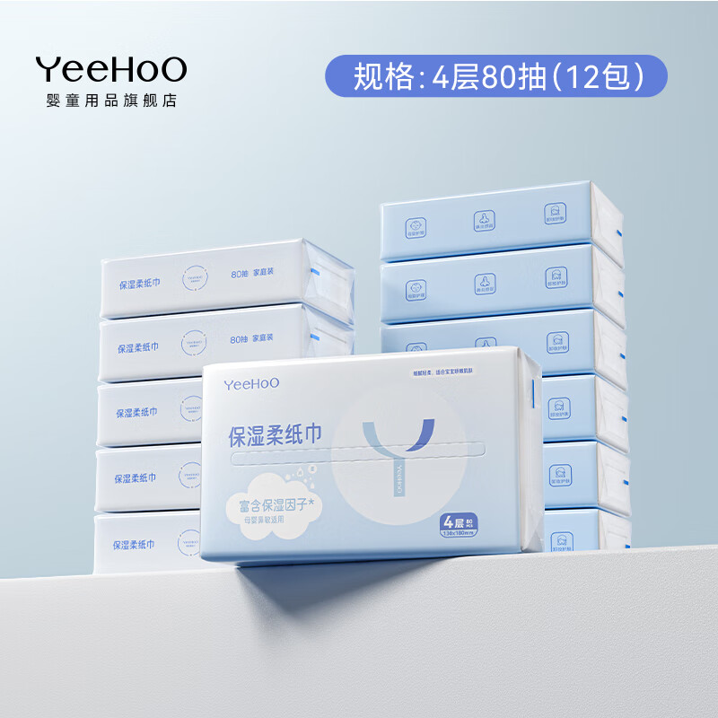 YEEHOO宝宝保湿纸巾婴儿云柔巾棉巾抽纸巾母婴便携旅行装婴幼儿超柔抽纸 YeeHoO保湿柔纸巾 4层 80抽*12包