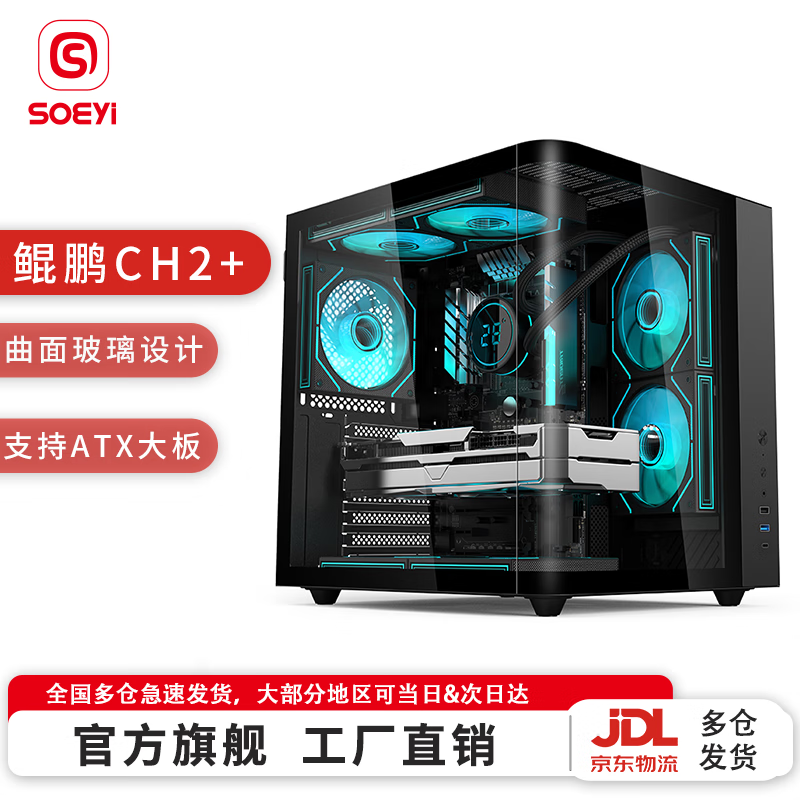 硕一鲲鹏CH2+ CH3+台式机电脑ATX主机箱白色侧透曲面弯玻海景房小尺寸机箱壳游戏电竞240水冷散热 【曲面玻璃】鲲鹏CH2+ 黑