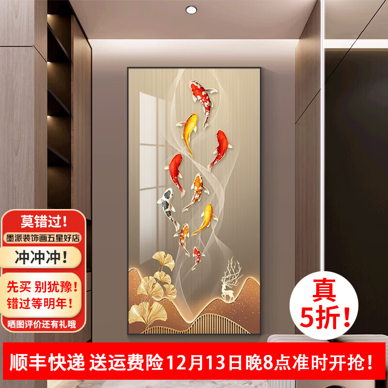 墨派 九鱼图入户正对门玄关装饰画现代简约竖版走廊过道挂画进门壁画 九鱼招财D款 80*160cm晶瓷+铝合金边框