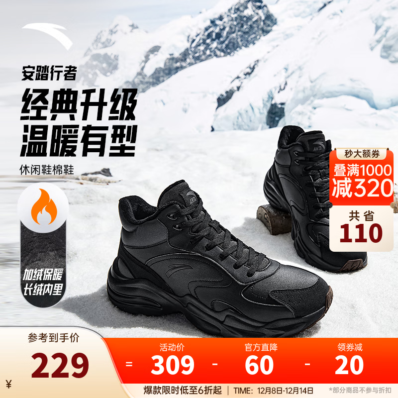 安踏行者丨大棉鞋男鞋高帮加绒加厚保暖运动休闲鞋冬季鞋东北雪地靴 【长绒版】基础黑/城堡灰-4 42 (男)