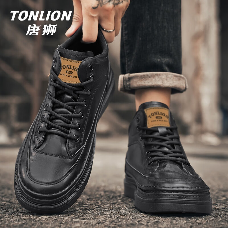 唐狮(TonLion)高帮男鞋子男春夏季英伦复古休闲皮鞋男运动马丁靴板鞋 黑色 43码