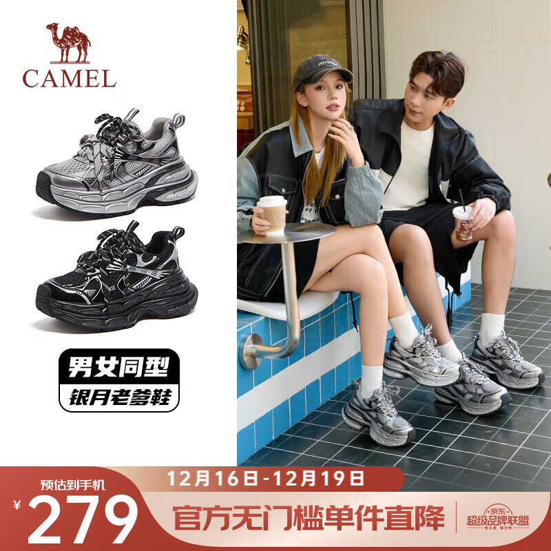 骆驼(CAMEL)【迪丽热巴同款】银月复古老爹鞋增高男女鞋运动休闲鞋情侣同款 L24A283742R 加绒黑/银 38