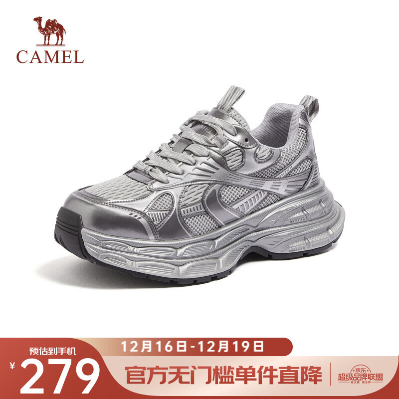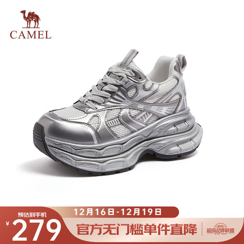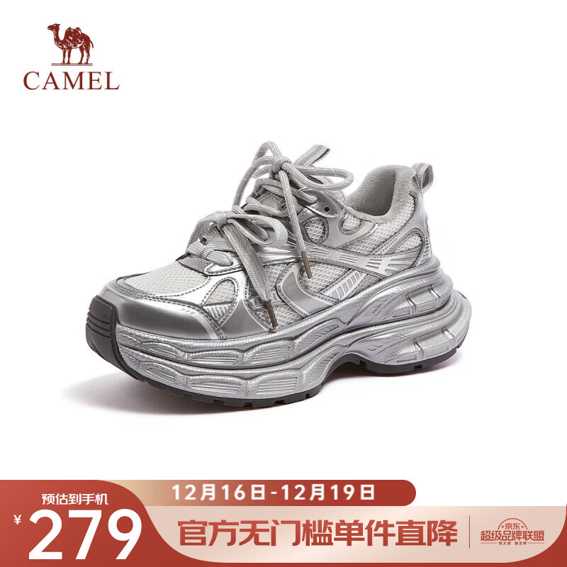 骆驼(CAMEL)【迪丽热巴同款】银月复古老爹鞋增高男女鞋运动休闲鞋情侣同款 L24A283742A 女款 银色 38