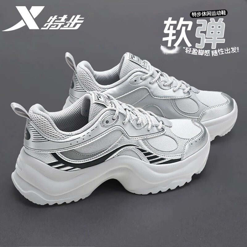 特步(XTEP)女鞋厚底老爹鞋2025新款冬季潮流增高休闲鞋子皮面防水缓震运动鞋 银色/青木灰 38
