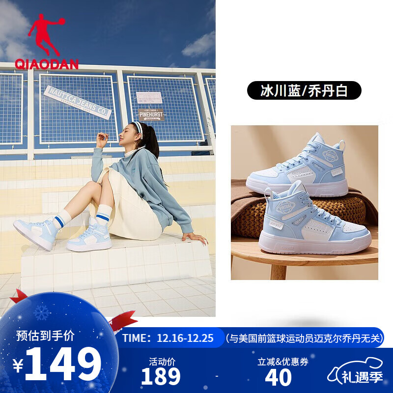 乔丹女鞋冬季高帮革面板鞋加绒保暖棉鞋防水休闲鞋运动鞋潮流撞色板鞋 冰川蓝/乔丹白(常规-女) 36