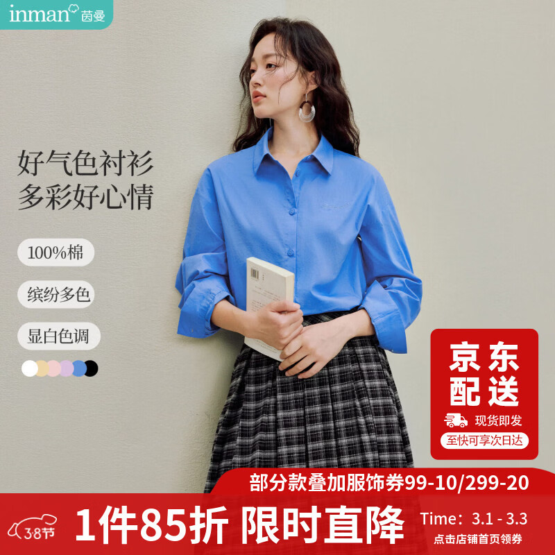 茵曼简约通勤纯棉蓝色衬衫2025秋女装新款翻领长袖衬衣 天空蓝 M