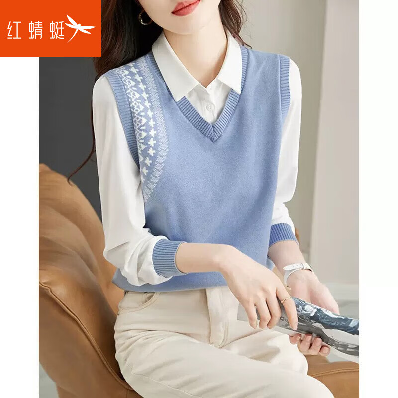 红蜻蜓 针织衫女假两件打底女装毛衣女春季新款韩版polo领上衣衫 蓝色常规 均码 (适合80-130斤)
