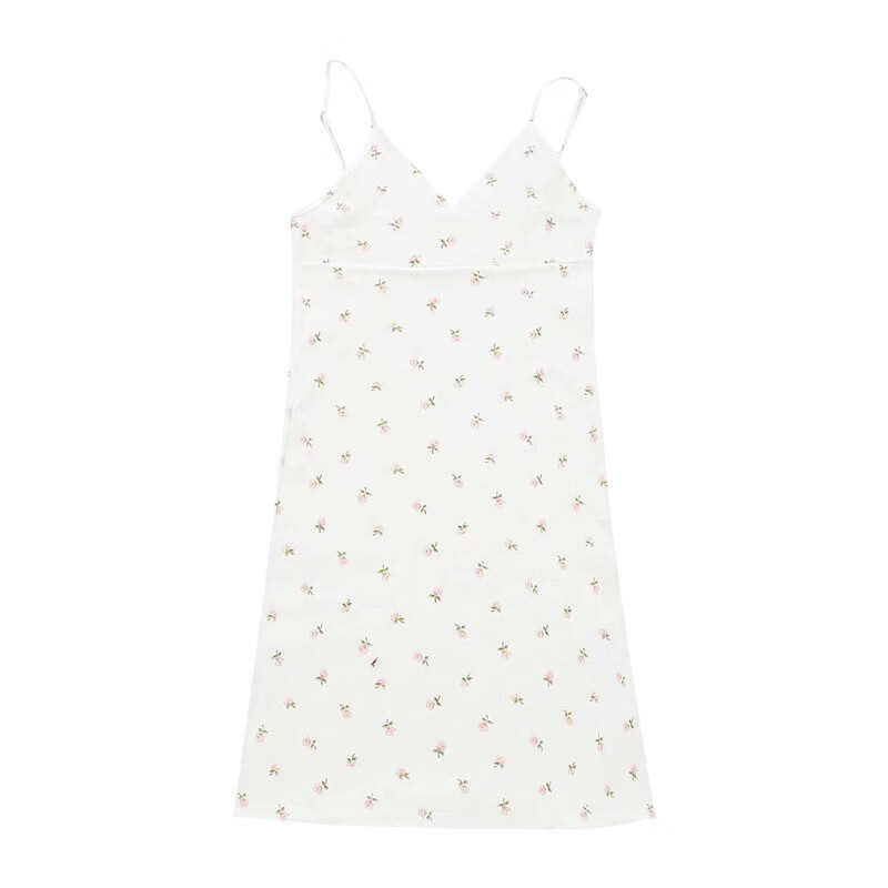 【严选】纯欲复古印花v领吊带连衣裙女夏碎花吊带裙女装 白色大花 S