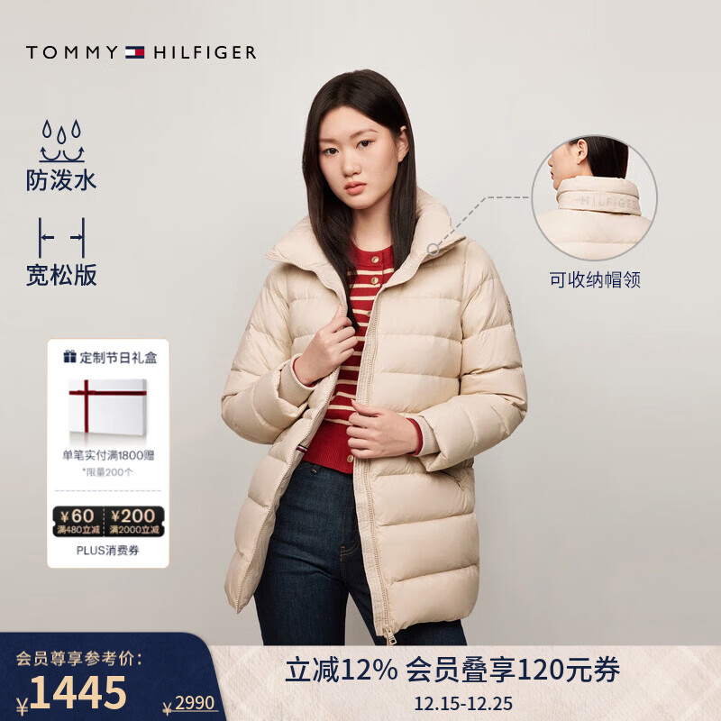 Tommy Hilfiger【防泼水】秋冬女装撼冬保暖休闲可收纳帽宽松双拉链羽绒服 米白色ACI S (推荐:100-115斤)