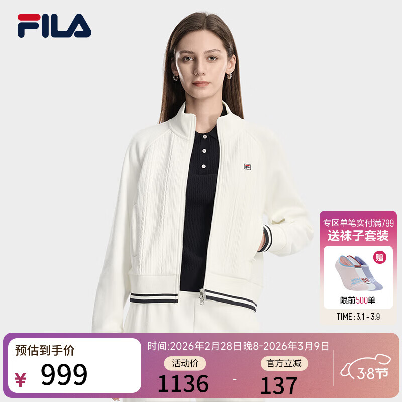FILA 斐乐官方女装针织长袖外套2026春季新款简约休闲舒适立领上衣 云菇白-WT S 160/80A/S