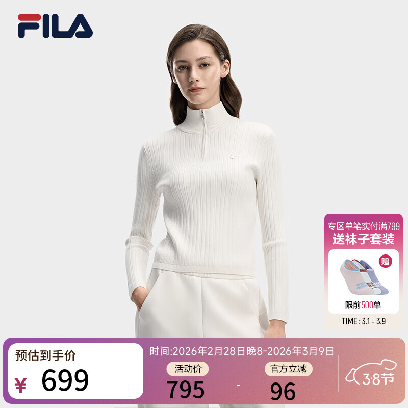 FILA 斐乐官方杨幂同款|女装编织衫2026春新款时尚修身坑条半拉链毛衣 雾莲白-IV M 165/84A/M