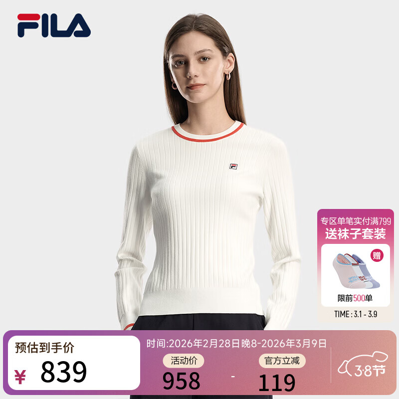 FILA 杨幂同款|斐乐官方女装编织衫2026春季新款时尚休闲修身套头毛衣 云菇白-WT L 170/88A/L