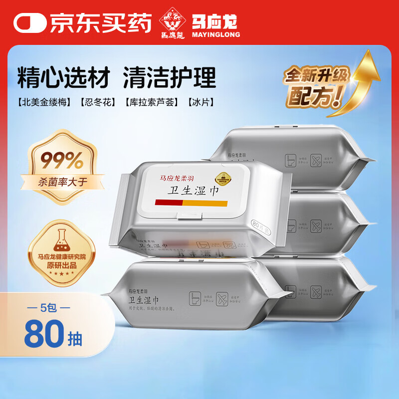 马应龙卫生湿巾湿厕纸80片*5包可冲散99%杀菌搭配清洁纸品囤货装痔疮CP