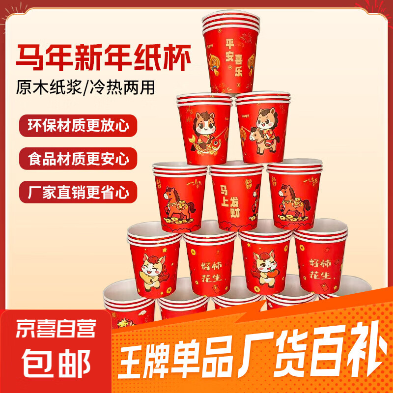 2026马年纸杯新年元旦一次性杯子红色喜庆加厚纸杯家用水杯不漏水 新年纸杯 50只(款式随机)